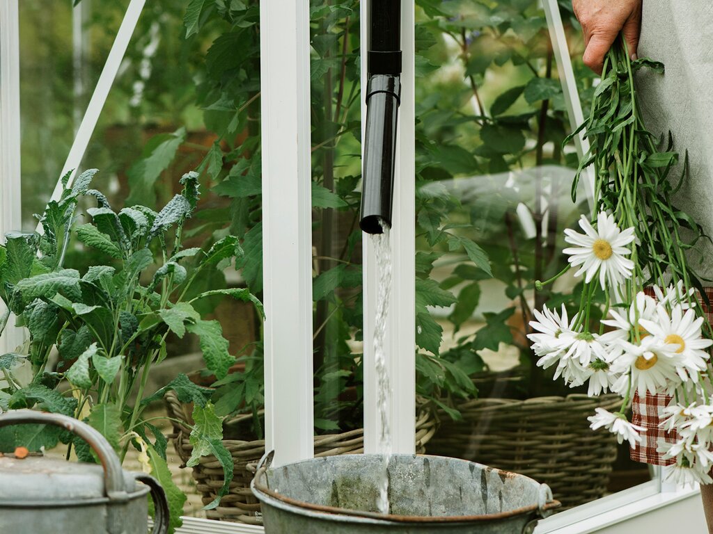 Drivhuset leveres med integrerte takrenner og overvannsrør som sikrer effektiv vannhåndtering. Dette gjør det enkelt å lede vann bort fra taket og gir samtidig mulighet til å samle regnvann for vanning. En praktisk og miljøvennlig løsning som bidrar til et tørt og ryddig område rundt drivhuset.
