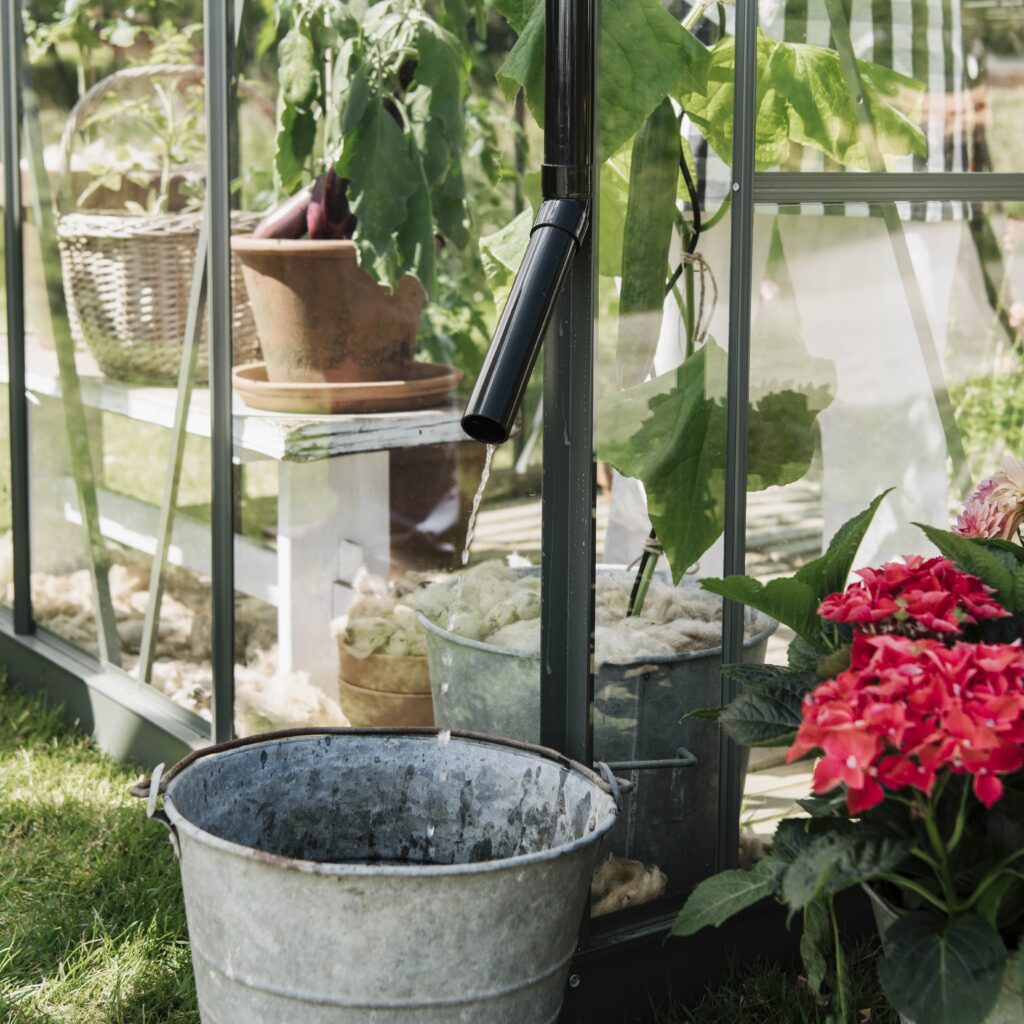 Drivhuset leveres med integrerte takrenner og overvannsrør som sikrer effektiv vannhåndtering. Dette gjør det enkelt å lede vann bort fra taket og gir samtidig mulighet til å samle regnvann for vanning. En praktisk og miljøvennlig løsning som bidrar til et tørt og ryddig område rundt drivhuset.