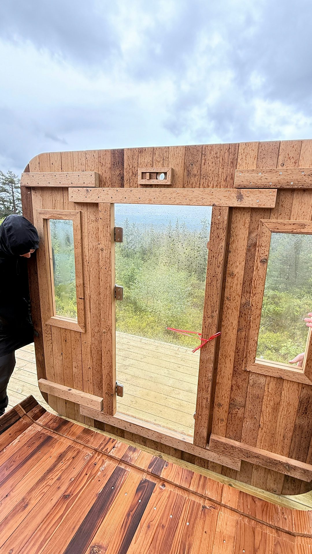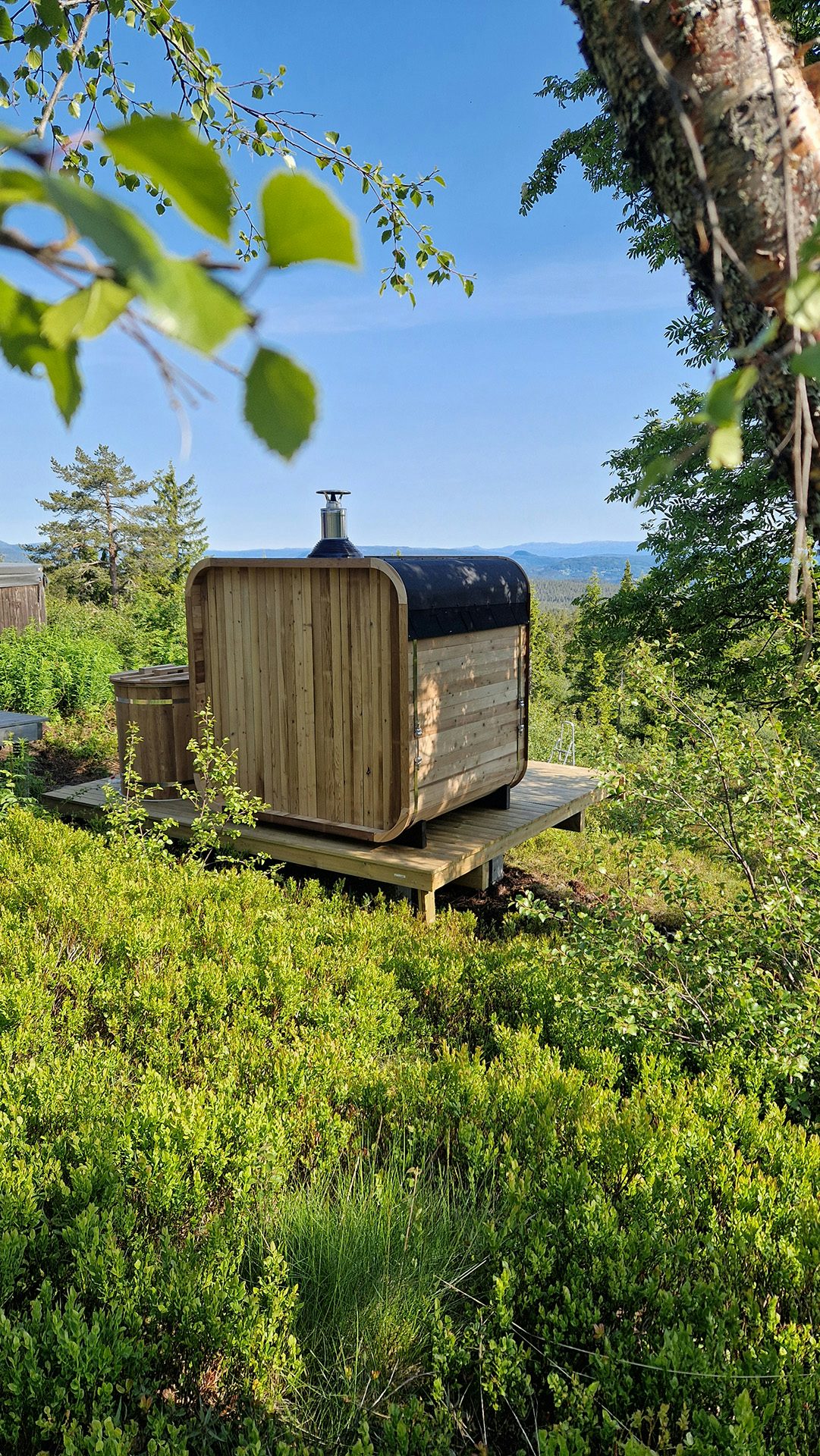 Saunaen fikk en nydelig plassering med utsikt utover fjellet. Vi hadde en plan om å stå opp midt på natten for å få med oss soloppgangen og knipse bilder av saunaen i det magiske morgenlyset. Det ble dessverre en noe skuffende opplevelse, men en kaffekopp i badstuen klokken 04:00 gjorde opp for mangelen på spektakulært lys.