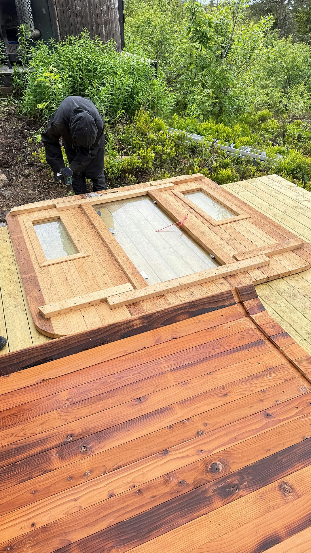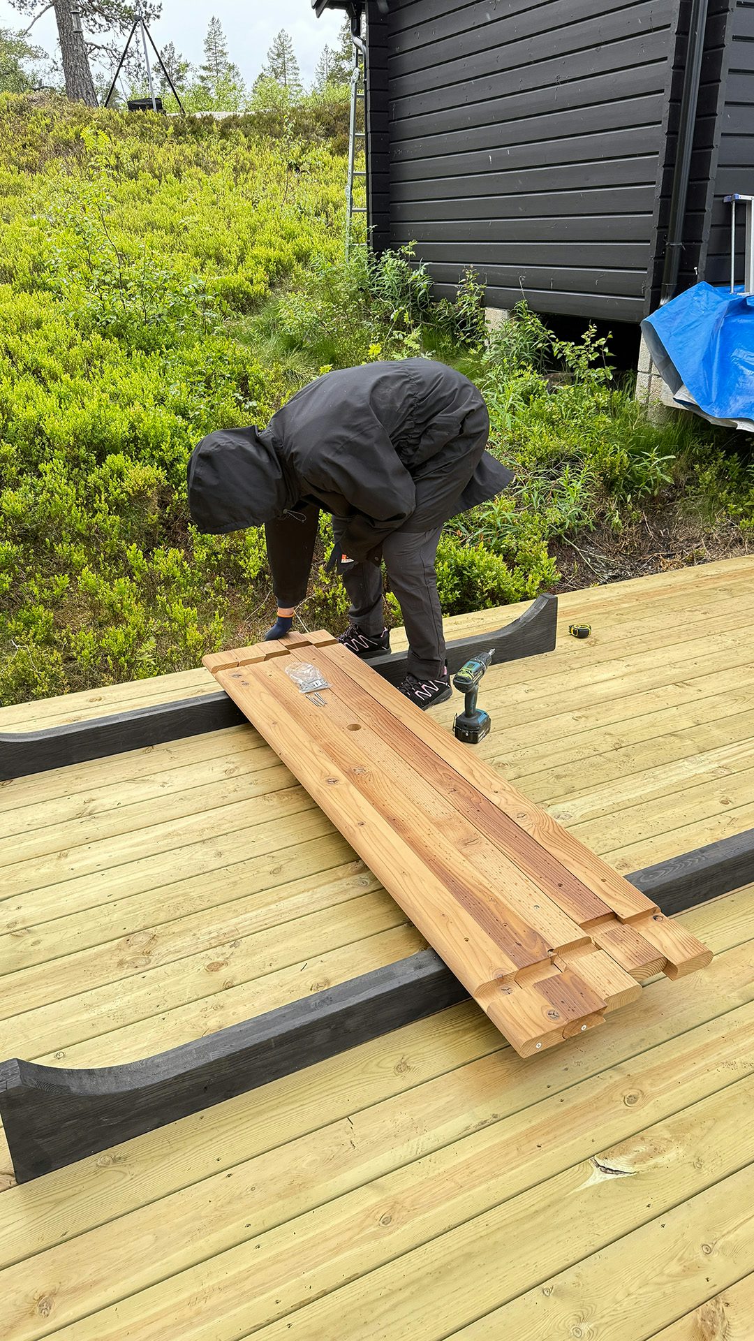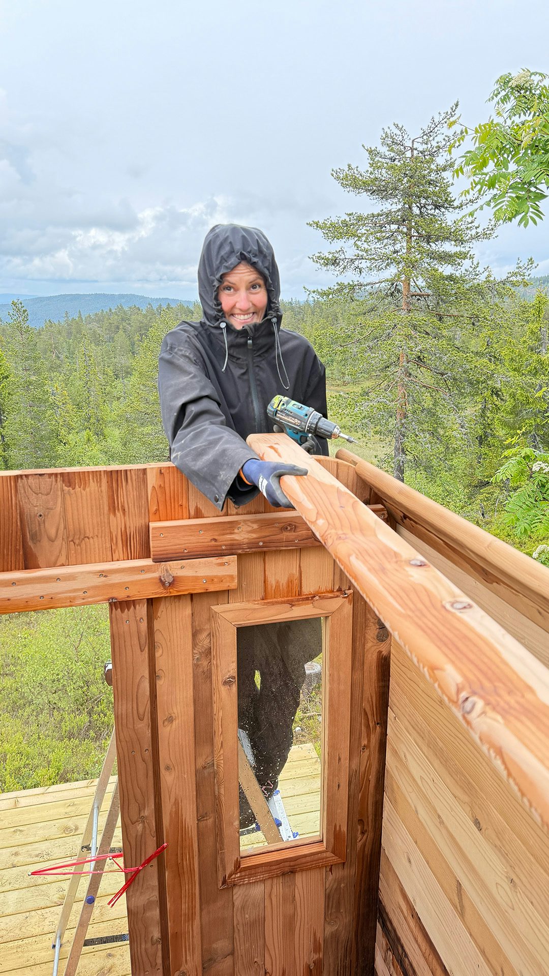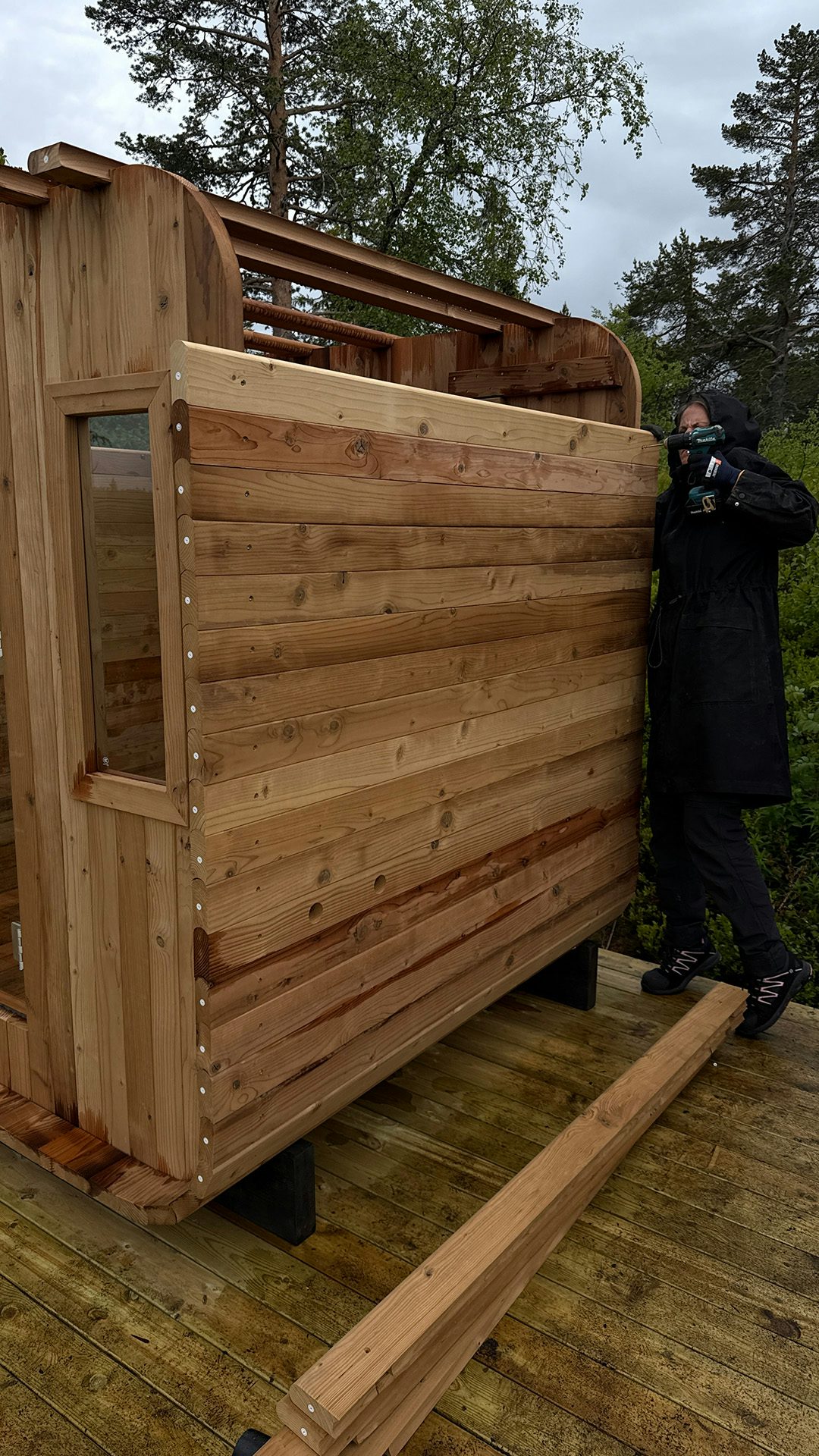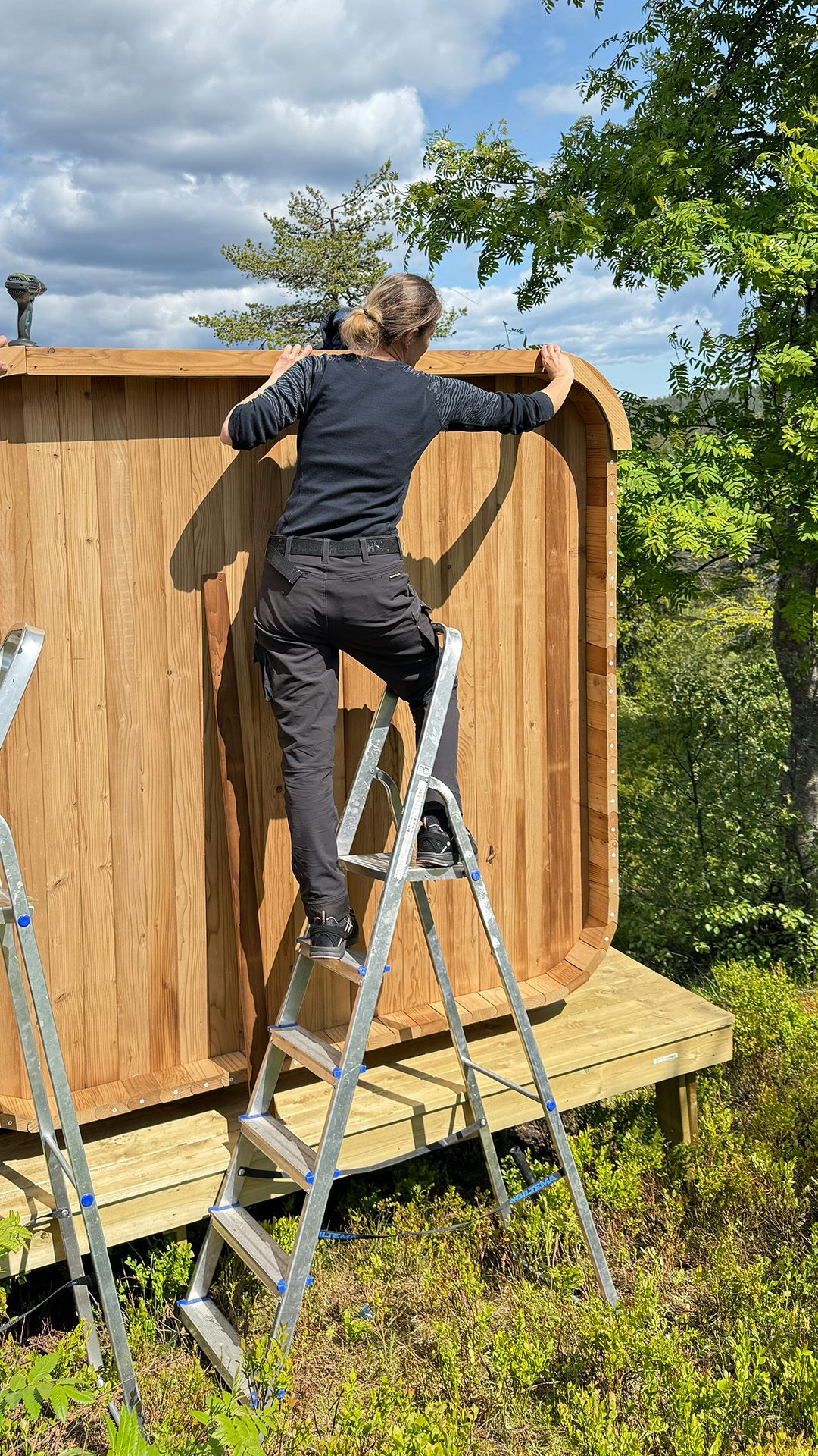 Monteringen av selve saunaen gikk overraskende lett. Faktisk så lett at Jon endte opp inne på hytta med laptoppen, mens damene sto for selve byggingen. Endeveggene leveres i tre ferdige seksjoner, og når de først er på plass, går resten lekende lett. Vi startet monteringen på kvelden den dagen vi kom, og til lunsj neste dag var saunaen ferdig satt opp.