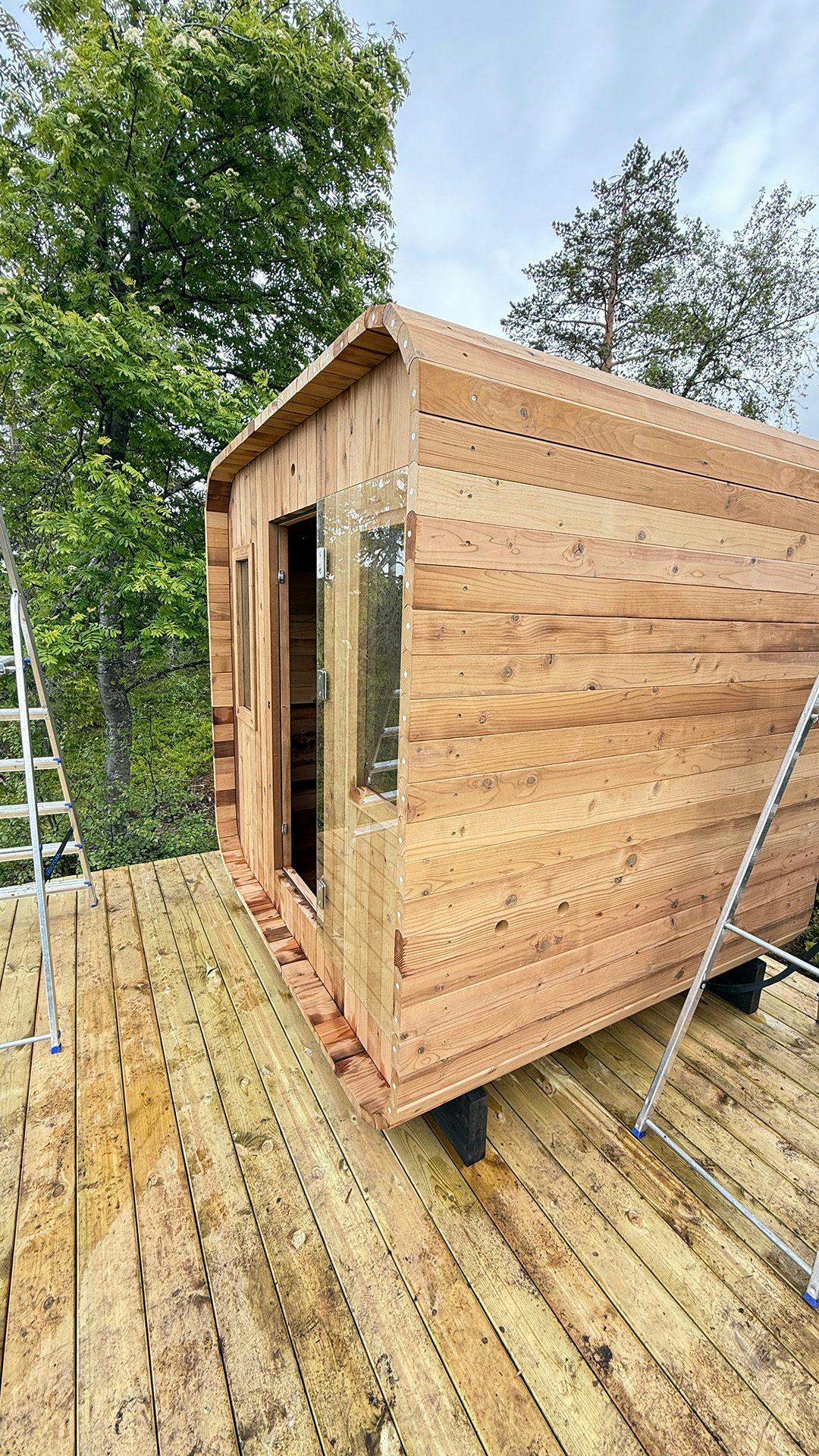 Første fyring av ovnen bør alltid gjøres uten folk i saunaen, slik at eventuelle gasser brennes av. Vi fulgte reglene, og etterpå kunne vi endelig teste at alt fungerte som det skulle. Det gjorde det – og vi må innrømme at man får veldig lyst på en slik løsning selv, enten hjemme i hagen eller på hytta.