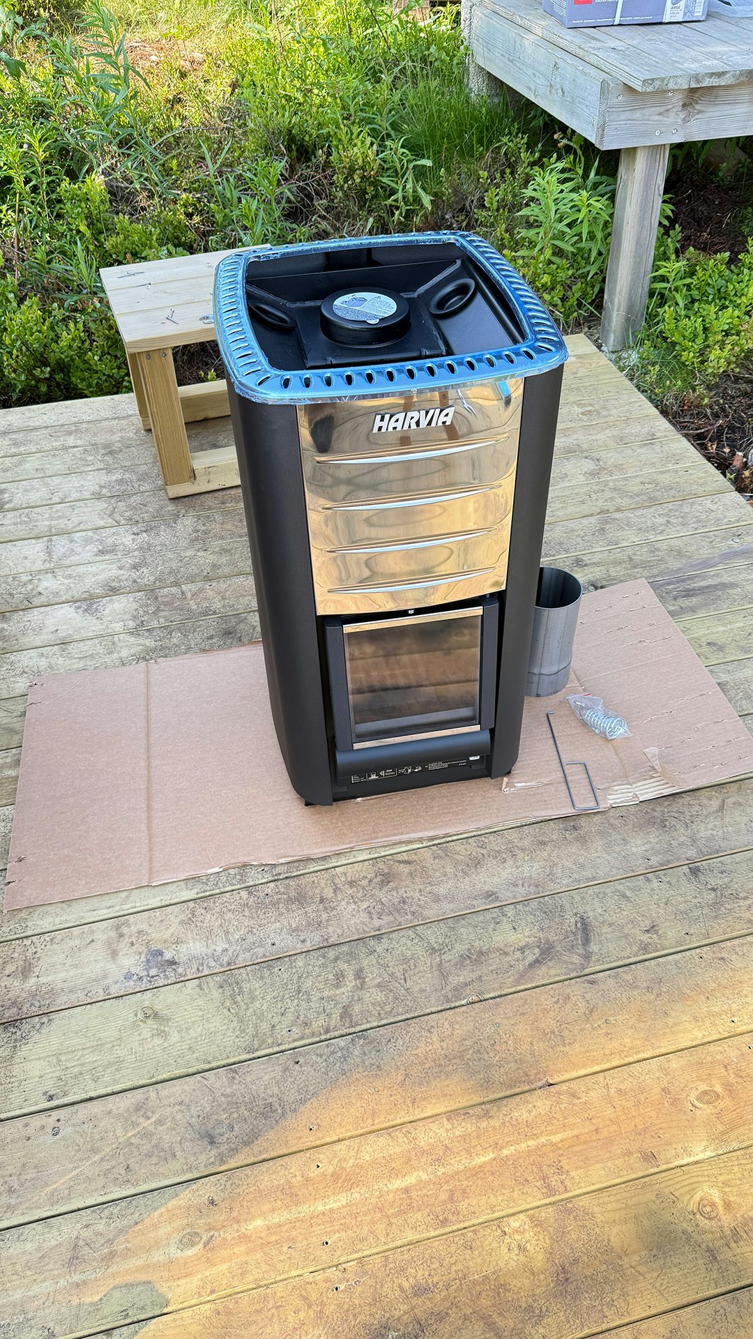 Ole hadde allerede gjort en strålende jobb med å bygge en flott platting som saunaen skulle stå på, så rammen var satt. Rita og Ellen tok med seg Jon for bistand til å montere ovnen – trygghet først, vi vil helst unngå at alt går opp i flammer ved første fyring!