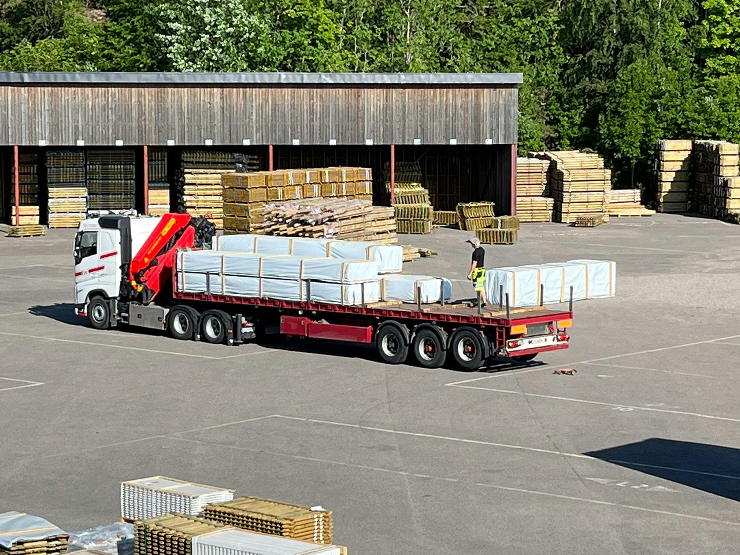 Vi holdt kontakten med Gustav hele veien slik at han var oppdatert på prosessen av produksjonen. Ettersom Gustav ønsket et påbygg i stedet for terrasse, samt tykkere materialer på laftebord og takbjelker måtte hele hytten sendes på en egen bil. Det ble lastet om på Borgeskogen i Stokke (våre lokaler) og sendt videre derfra med en kranbil. På grunn av at veien er svingete og med lave jernbaneunderganger måtte Gustav møte sjåføren i Skien for å vise vei hvor tungtransport kunne kjøre.