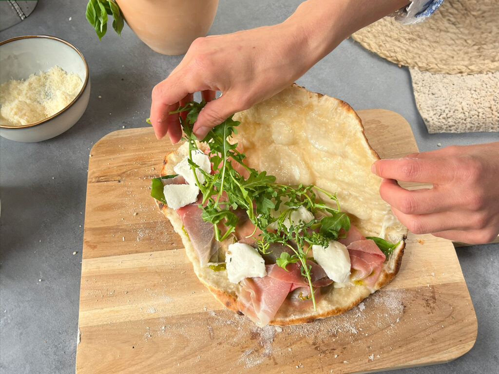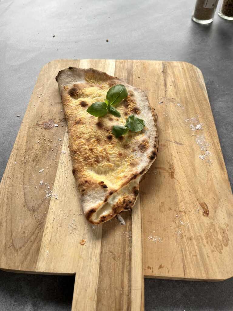 Form bunnen så den blir ca 15-20 cm i diameter. Ha godt med olje på deigen og brett den så i to. Den blir da enkel å åpne etter steking. Vi har i tillegg litt olje og parmesan på toppen for ekstra sprøhet og smak. Stekes i pizzaovnen til den er gylden og sprø(dette går raskt, så følg med).