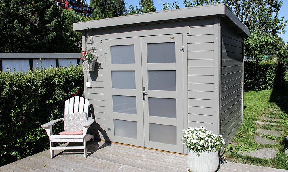 Ved å sette opp redskapsboden Ås 2 har de ikke bare fått et praktisk sted til oppbevaring av hageredskaper og utstyr – de har også skapt et lunt og innbydende solhjørne rett ved siden av.