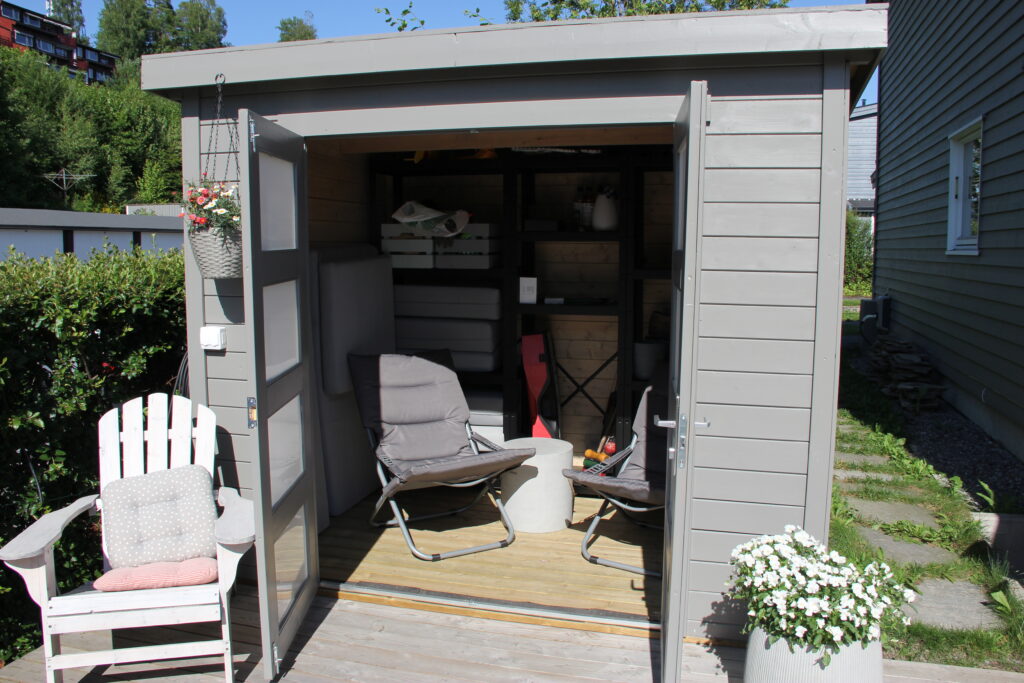 Denne smarte kombinasjonen viser at man ikke trenger mye plass for å skape noe både praktisk og koselig. Med litt planlegging kan en bod bli mer enn bare oppbevaring – den kan bli en del av selve uterommet.