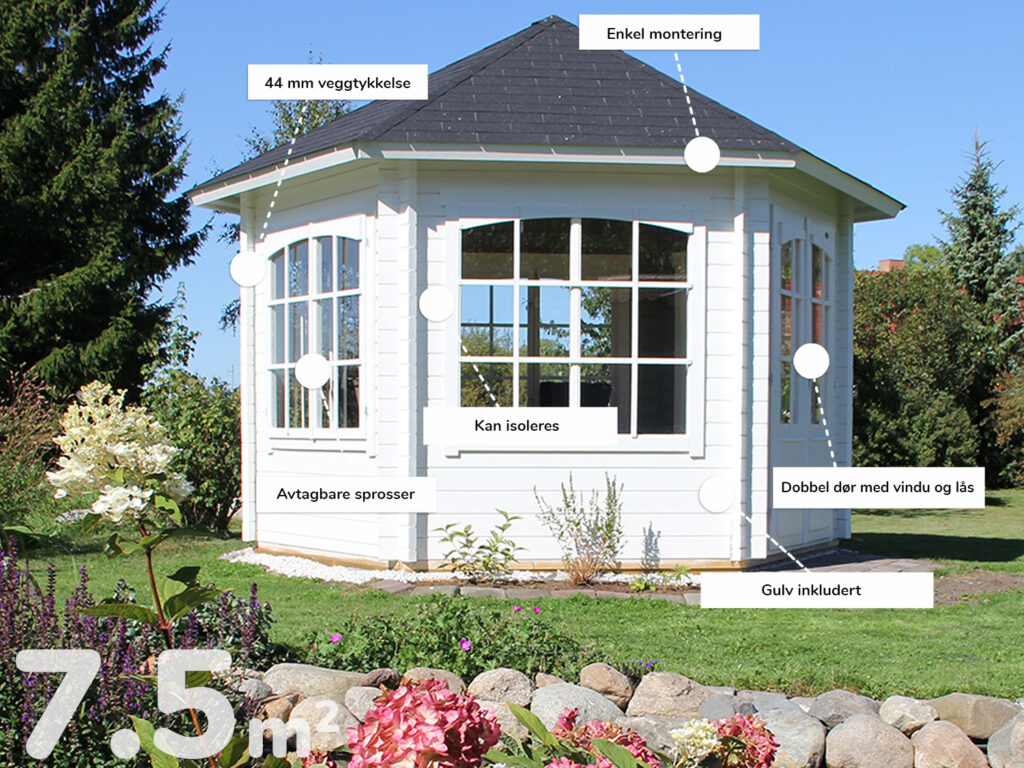 Huset er bygget i laft med 44 mm tykke vegger, noe som gir god stabilitet og en lun følelse – et lysthus som tåler norske forhold. Det leveres som komplett byggesett med alt av festemidler og en tydelig monteringsanvisning, slik at det var mulig for kunden å sette det opp relativt raskt og uten stor ekstern hjelp. I tillegg kan sprossene på dører og vinduer tas av, slik at huset får et enda mer moderne uttrykk når man ønsker det.